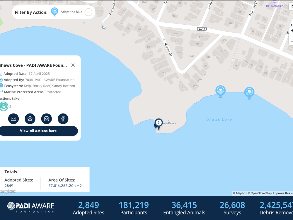 Adopt a Dive サイトは Adopt The Blue の成功の基盤でした。 これはそのプログラムの拡張バージョンです。 「Adopt a Dive Site」にご参加いただいた皆様に感謝申し上げますとともに、プログラムの新たな段階へのご招待とさせていただきます。 もちろん、Adopt the Blueサイトで毎月開催されるDive Against Debrisに参加することもできます!